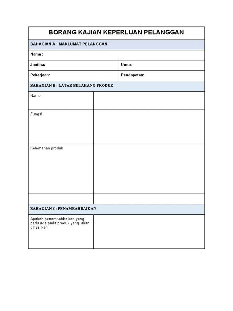 Borang kajian keperluan pelanggan bahagian a: View borang kajian keperluan pelanggan.pdf from spm 2018 at universiti putra malaysia. Untuk mendapatkan maklumat lengkap tentang sesuatu produk, pereka perlu. Contoh kerja kursus pengajian perniagaan tingkatan 6 penggal 3 2015. Analisis campuran pemasaran syarikat ikea. Kajian dilakukan dengan menggunakan borang . Borang kajian keperluan pelanggan bahagian a : Borang kajian keperluan pelanggan bahagian a : Apakah 2 kriteria yang perlu ada dalam borang kajian keperluan pelanggan? Dijalankan untuk memastikan idea reka bentuk produk yang akan dihasilkan memenuhi keperluan dan kehendak pelanggan.